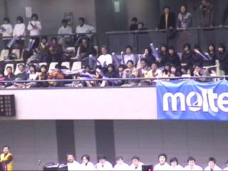(県立体育館グリーンアリーナ・小)地元最終戦にしてはちょっと寂しい応援。会場が狭いので遠慮したかな?。 スティックが沢山配られるかと思ったらメガホンを沢山配って、Sは無し。 よって、予定を変えて、50ほど青炎隊のS配布となり、今治分が減りましたです。 試合前の観客席への投げ込みグッズ、生駒選手の上段への遠投により何であるか解りました。 もっとも、となりの女子中学生がゲットしましたが・・・ |